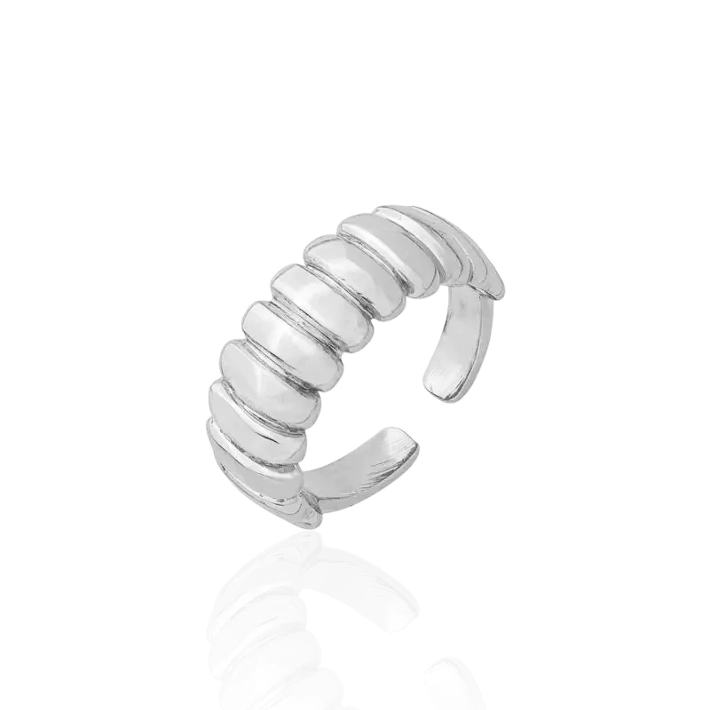 ANEL DE MODELO REGULÁVEL EM FORMA PEQUENA PARA USO NO DEDINHO COM DETALHE FRISADO NO ACABAMENTO LISO. DISPONÍVEL NO BANHO DE OURO 18K E RÓDIO BRANCO.