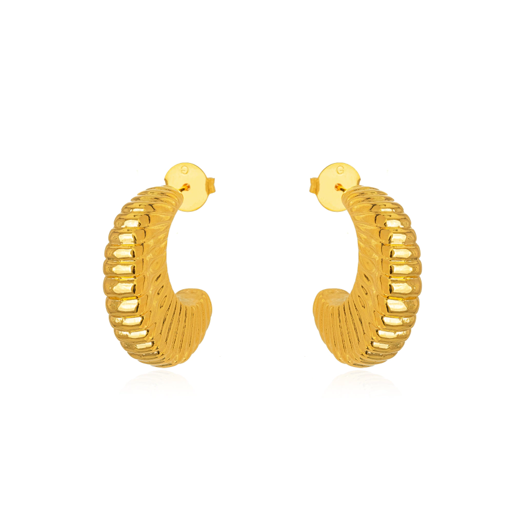 BRINCO MODELO ARGOLA DE TAMANHO MÉDIO COM ACABAMENTO FRISADO. DISPONÍVEL NO BANHO DE OURO 18K E RÓDIO BRANCO.