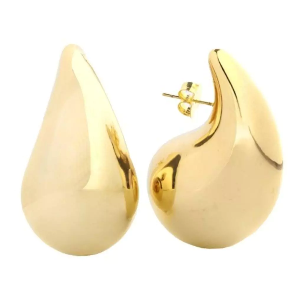 BRINCO DE TAMANHO MAXI EM FORMATO DE GOTA ABAULADA COM ACABAMENTO LISO. DISPONÍVEL NO BANHO DE OURO 18K E RÓDIO BRANCO.