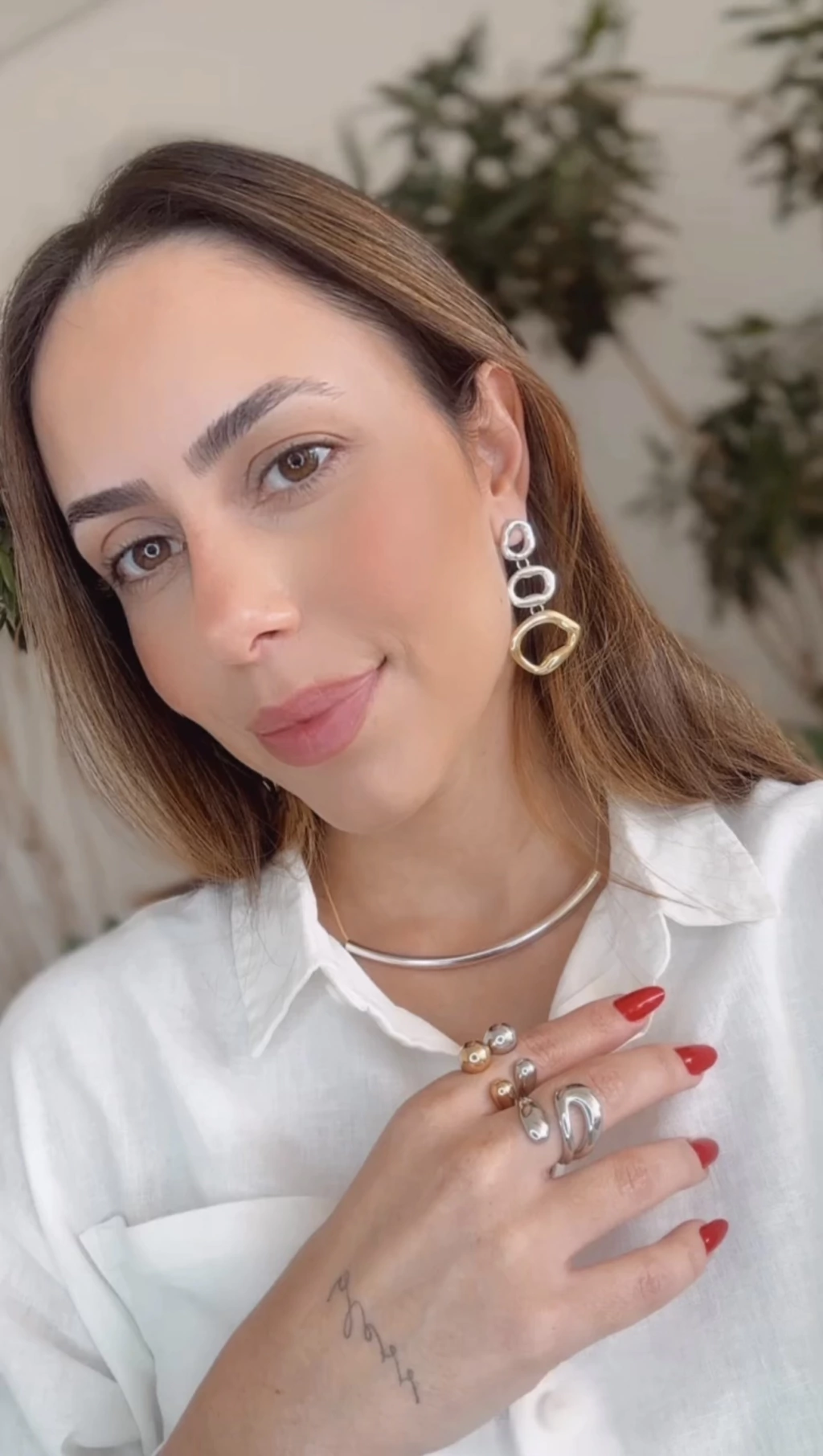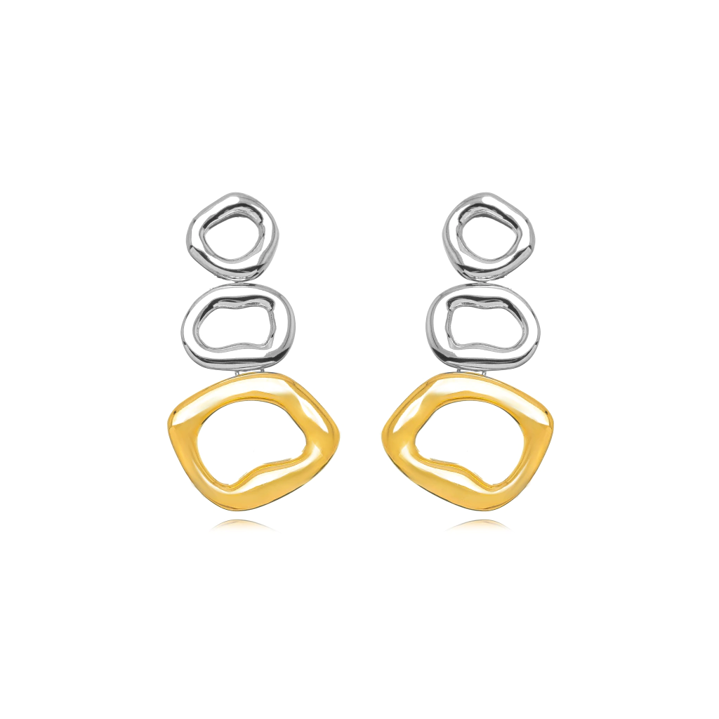 BRINCO ALONGADO EM FORMATO ORGÂNICO COM MISTURA DE BANHOS NO ACABAMENTO POLIDO LISO.