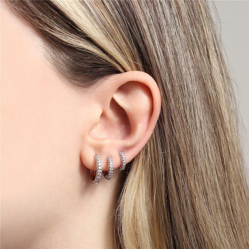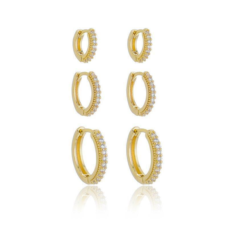 BRINCO TRIO DE ARGOLINHAS EM TRÊS TAMANHOS DIFERENTES COM CRAVAÇÃO EM MICRO ZIRCÔNIA CRISTAL. DISPONÍVEL NO BANHO DE OURO 18K E RÓDIO BRANCO.