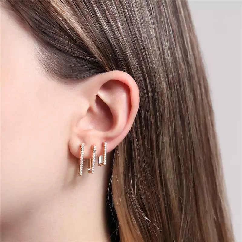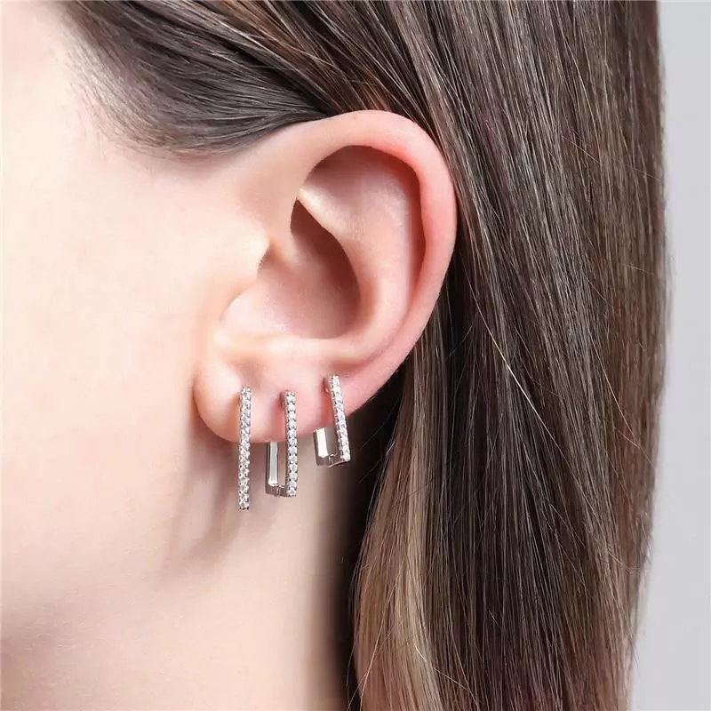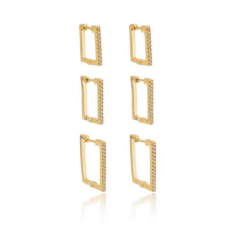 BRINCO TRIO DE ARGOLINHAS EM FORMATO QUADRADO DE TAMANHOS DIFERENTES CRAVEJADAS EM MICRO ZIRCÔNIA CRISTAL. DISPONÍVEL NO BANHO DE OURO 18K E RÓDIO BRANCO.