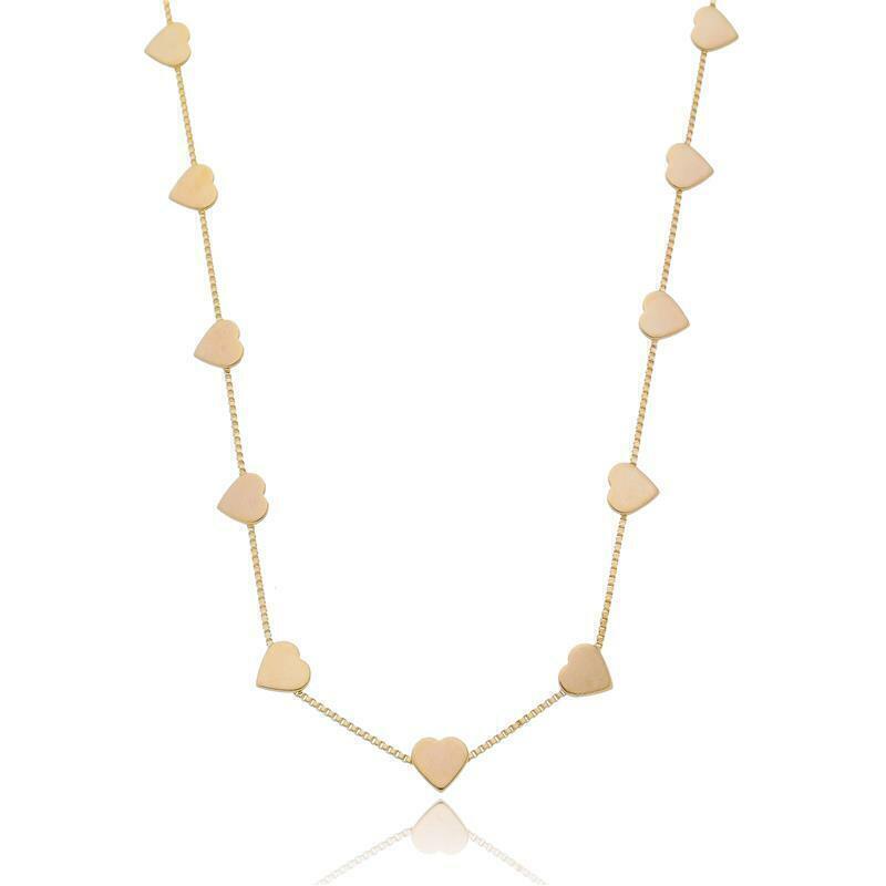 COLAR MODELO CHOKER COM CORAÇÕES LISOS CHAPADOS. DISPONÍVEL NO BANHO DE OURO 18K E RÓDIO BRANCO.