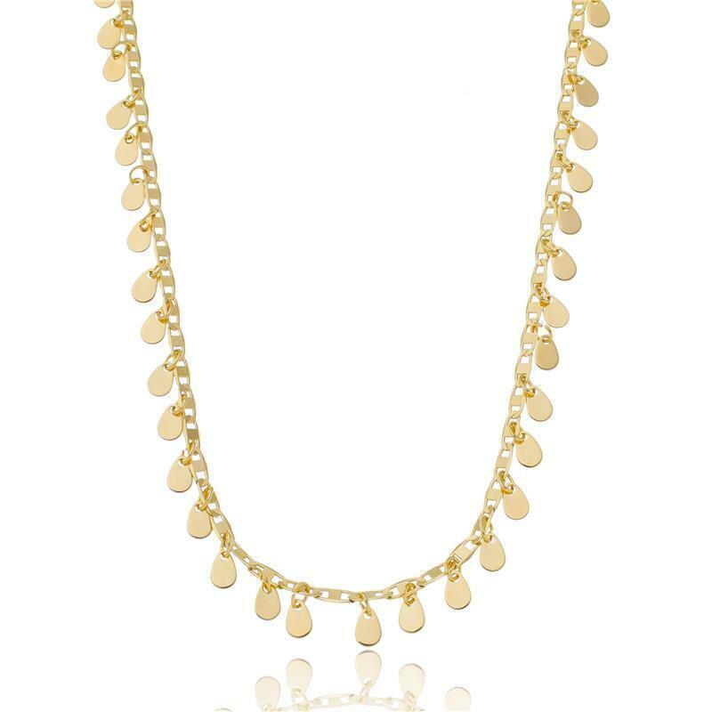 COLAR MODELO CHOKER EM CORRENTE DE ELO PIASTRINE E COM PINGENTES EM FORMATO DE GOTAS. DISPONÍVEL NO BANHO DE OURO 18K E RÓDIO BRANCO.