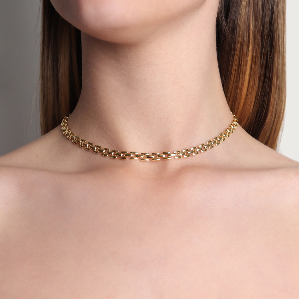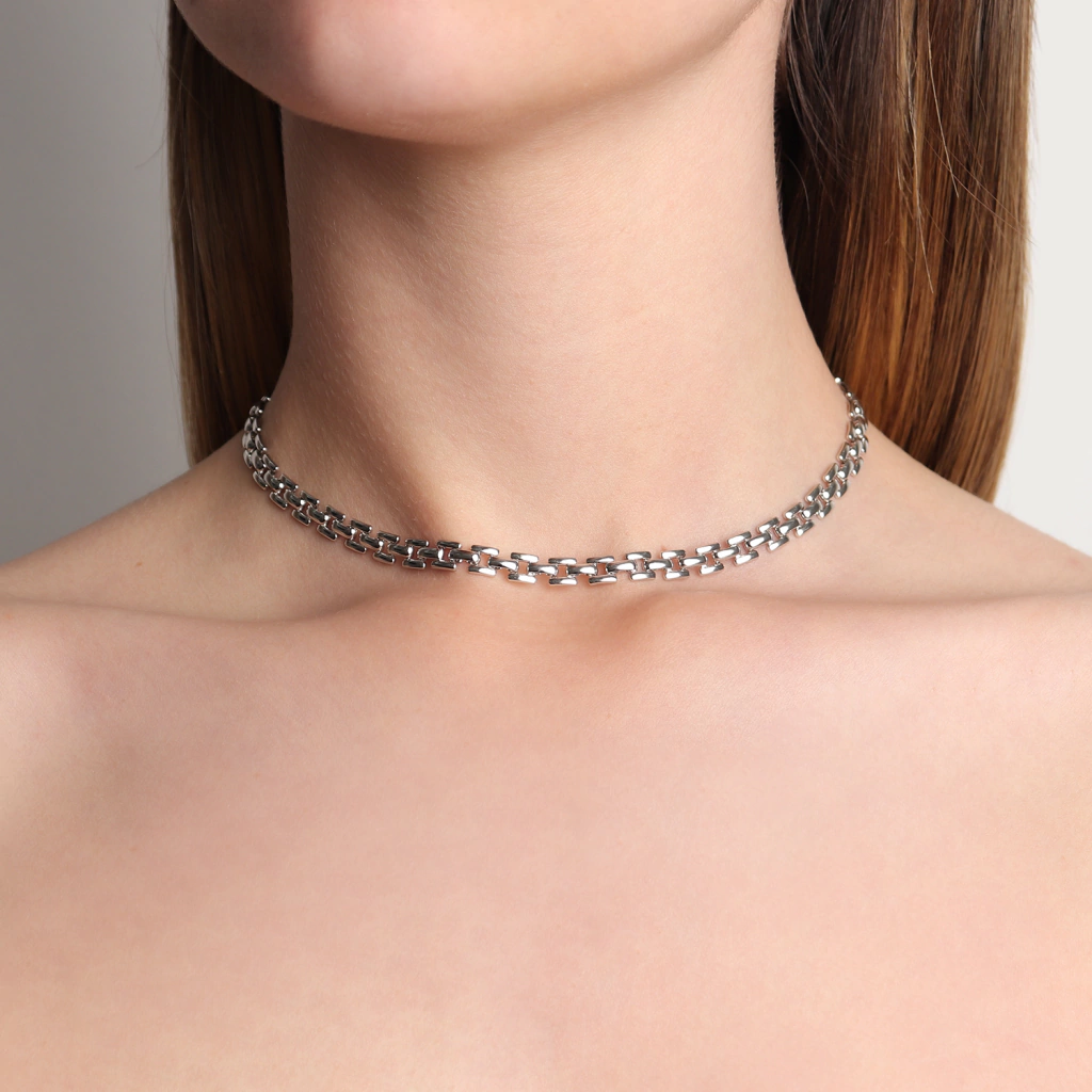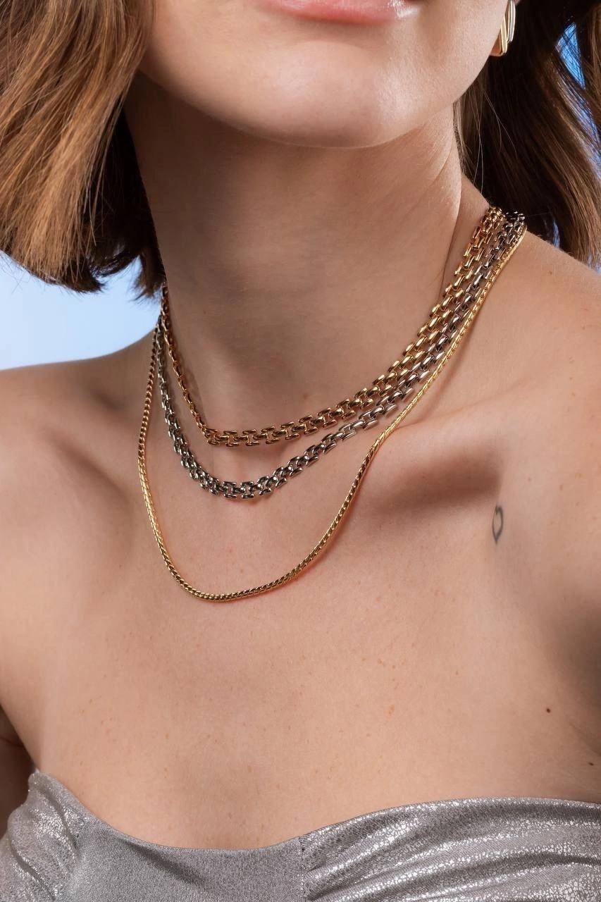 COLAR MODELO CHOKER EM MALHA RELÓGIO. DISPONÍVEL NO BANHO DE OURO 18K E RÓDIO BRANCO.