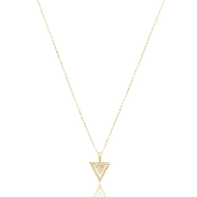COLAR DELICADO COM PINGENTE EM FORMATO DE TRIÂNGULO CRAVEJADO EM MICRO ZIRCÔNIA CRISTAL. DISPONÍVEL NO BANHO DE OURO 18K E RÓDIO BRANCO.