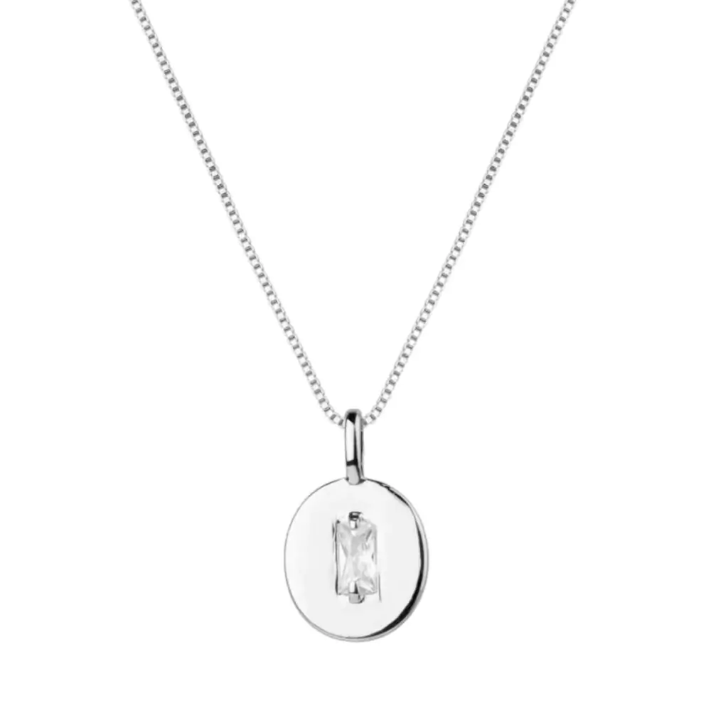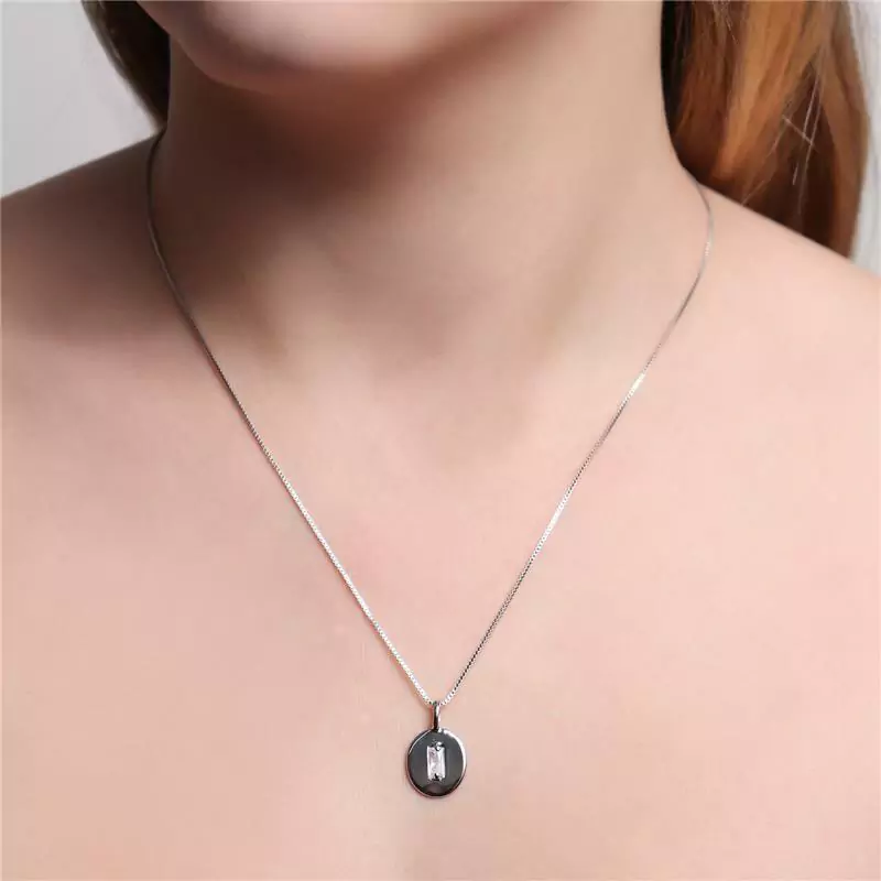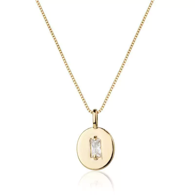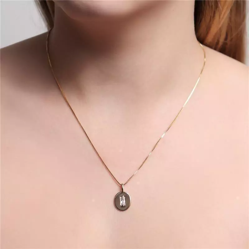COLAR EM CORRENTE VENEZIANA DELICADA COM PINGENTE MEDALHA COM UMA ZIRCÔNIA BAGUETE SUPER BRILHANTE. DISPONÍVEL NO BANHO DE OURO 18K E RÓDIO BRANCO.